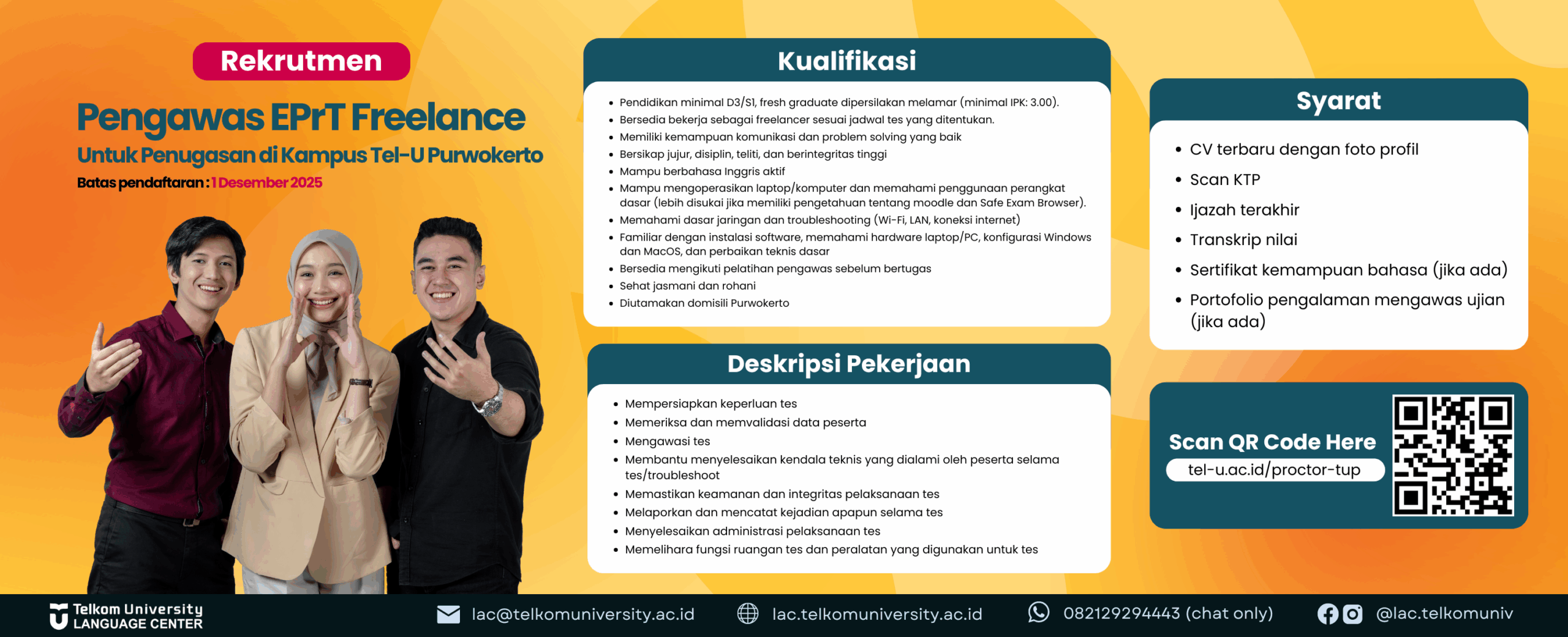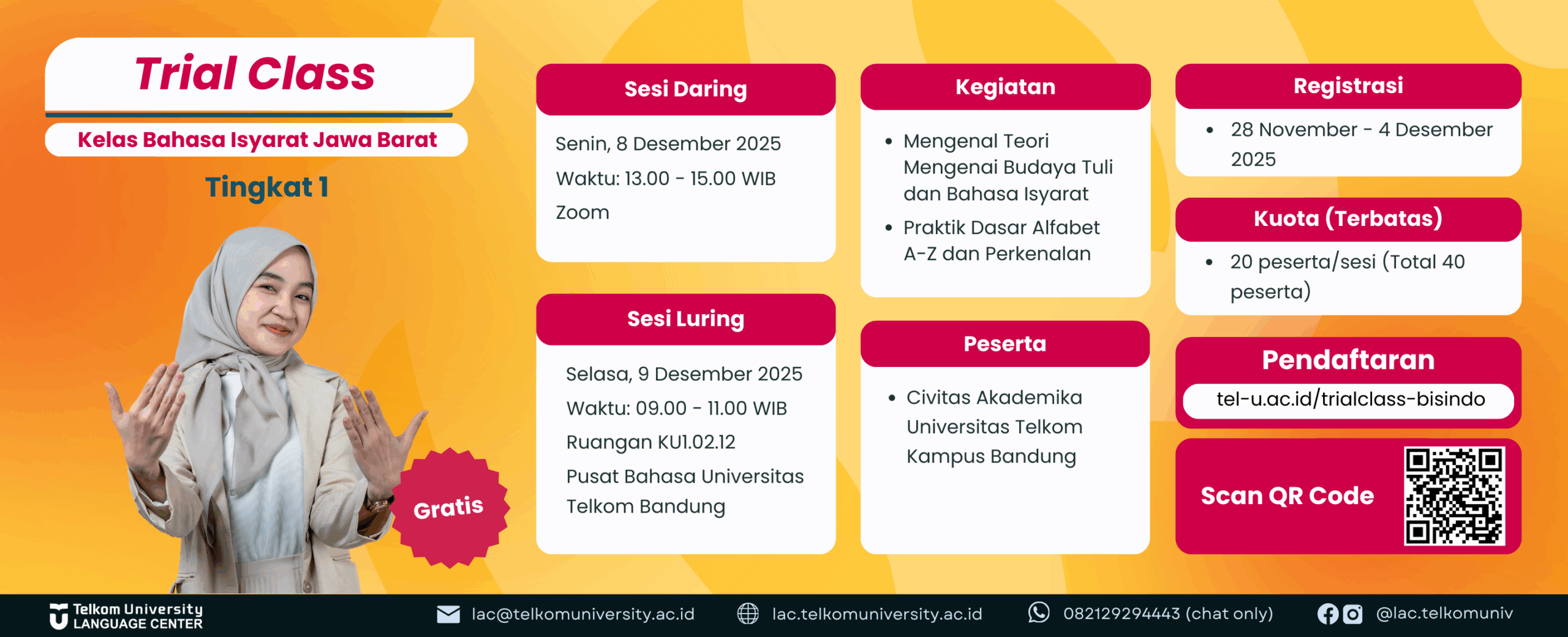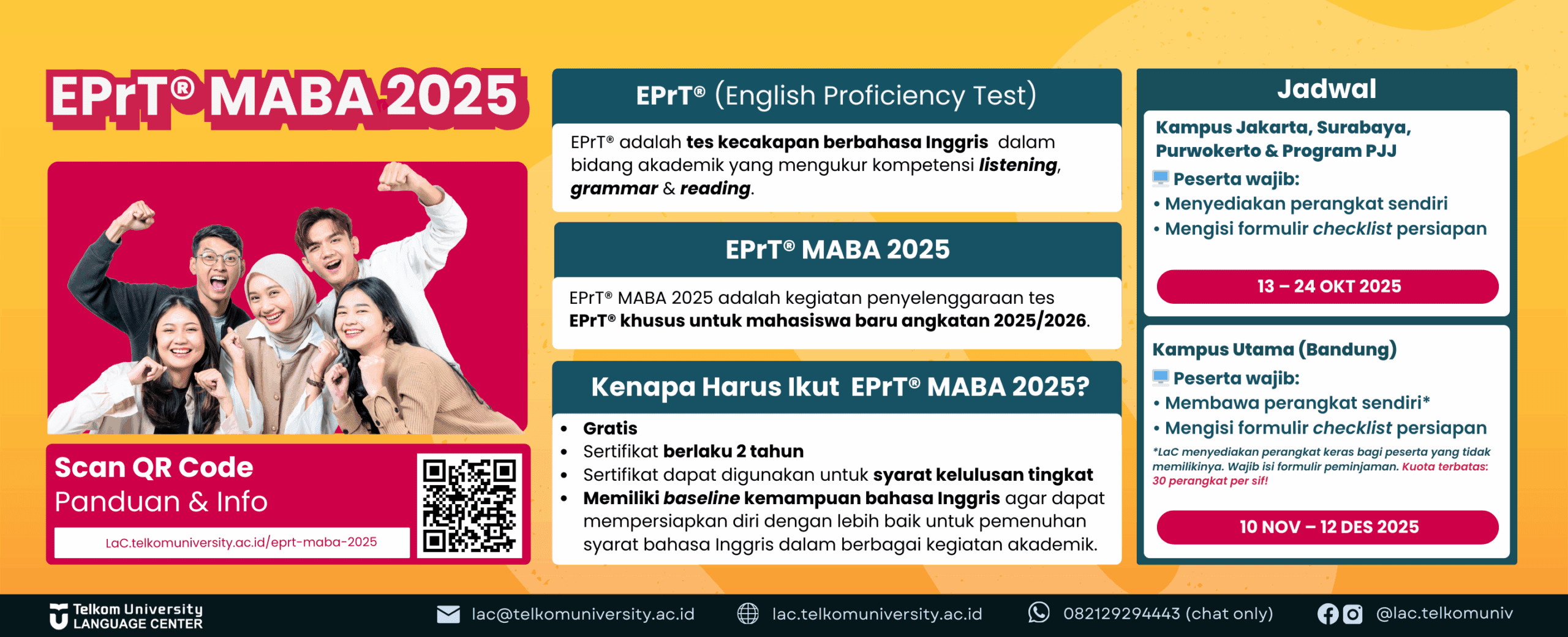 Kini layanan kursus bahasa, tes bahasa serta terjemahan dapat diikuti oleh seluruh civitas Telkom University di Bandung, Jakarta, Surabaya dan Purwokerto