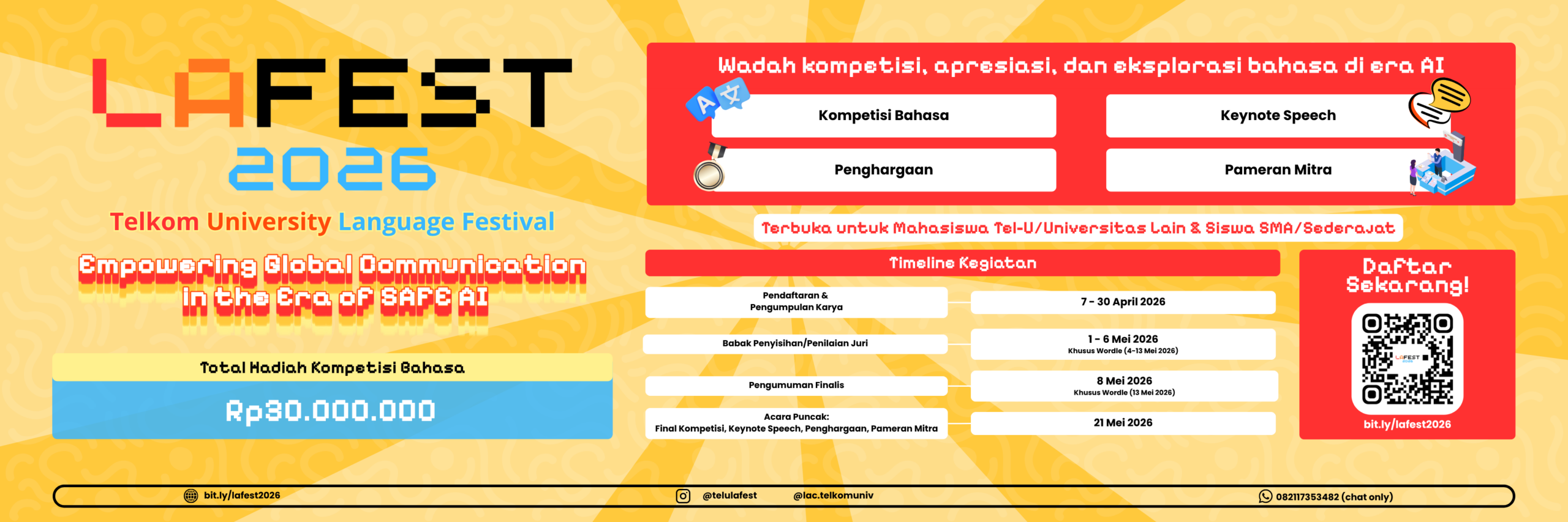 Kini layanan kursus bahasa, tes bahasa serta terjemahan dapat diikuti oleh seluruh civitas Telkom University di Bandung, Jakarta, Surabaya dan Purwokerto