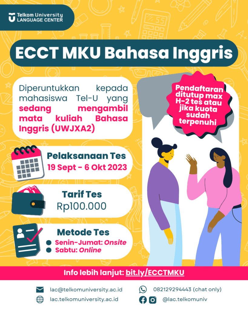Tes ECCT dijadikan salah satu implementasi bagi mahasiswa dalam menguasai keterampilan berbahasa Inggris, khususnya dalam kemampuan berbicara bahasa Inggris. Tes ini diperuntukkan kepada mahasiswa Telkom University yang SEDANG MENGAMBIL mata kuliah Bahasa Inggris (UWJXA2).