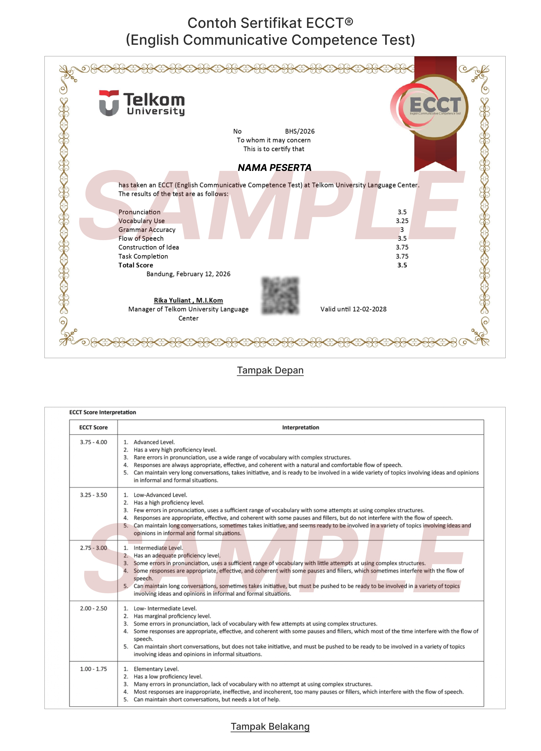 Tes ECCT® dilaksanakan secara onsite di Gedung Pusat Bahasa Grha Cacuk Sudarijanto-A. Khusus untuk mahasiswa PJJ, Telkom University Kampus Jakarta, Telkom University Kampus Surabaya, dan Telkom University Purwokerto, tes dilaksanakan secara online dan hanya dibuka pada hari Senin, Rabu, dan Jumat pada tanggal yang sudah ditentukan di atas.