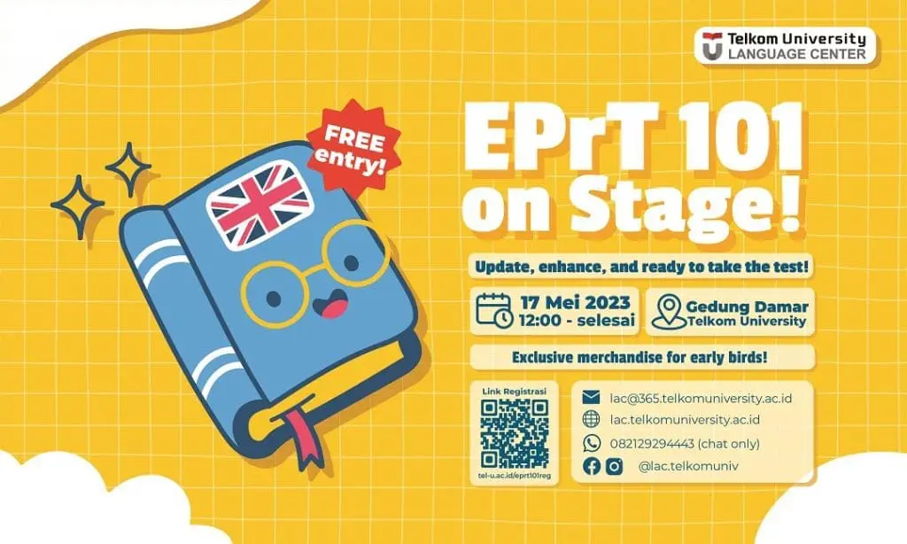 Dalam mensosialisasikan pentingnya EPrT terutama untuk pendaftaran sidang, Pusat Bahasa Universitas Telkom mempersembahakan EPrT 101 on Stage yang bertujuan untuk memberikan informasi tentang EPrT, manfaat EPrT, serta tips dan strategi untuk mendapatkan skor EPrT yang maksimal. Selain itu, acara ini juga memberikan kesempatan bagi mahasiswa untuk berlatih dan menguji kemampuan bahasa Inggris mereka melalui simulasi tes dan sesi tanya jawab.
