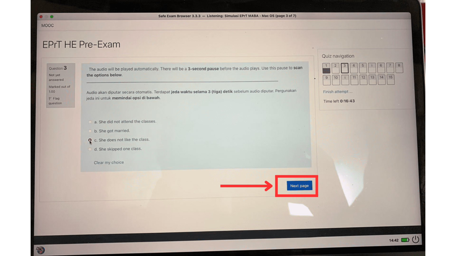 14. In the Listening Section, you can move to the next question by pressing Next Page. On Mac OS, there is NO RELOAD BUTTON. Ensure that you have filled in every number in the Listening Section, because in the Listening Section you cannot go Back or Reload.