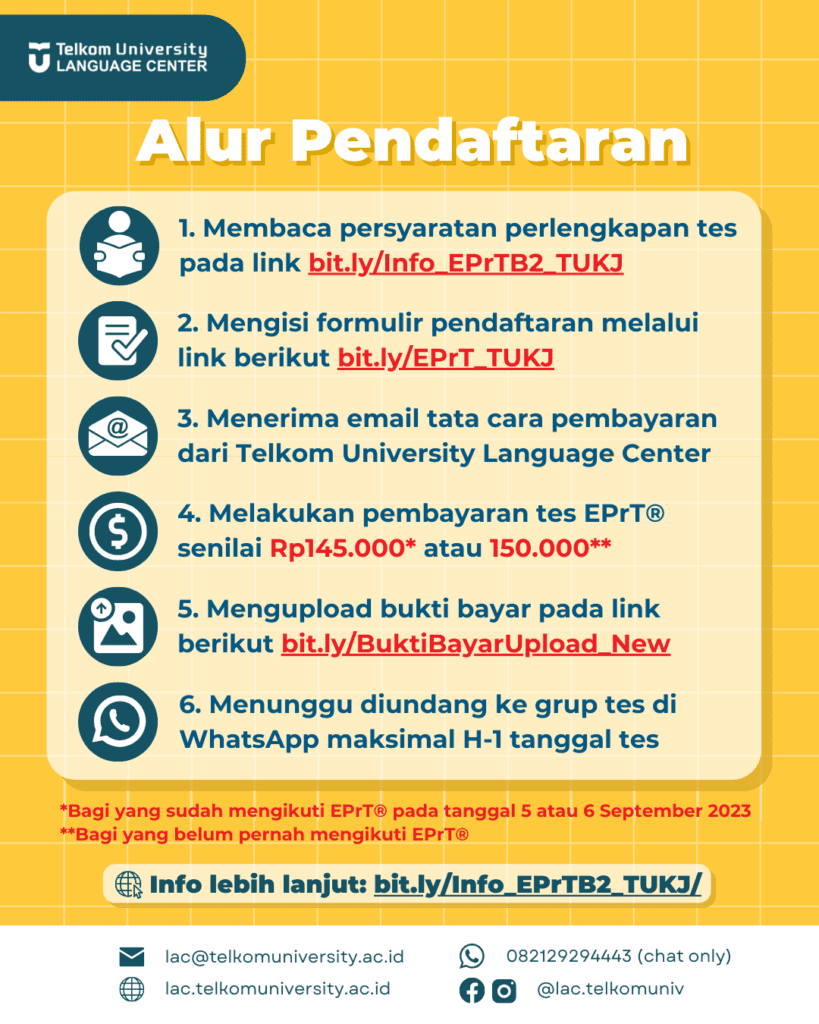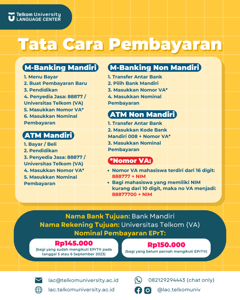- Melakukan pembayaran tes EPrT® senilai Rp145.000 (bagi mahasiswa yang sudah mengikuti EPrT® pada tanggal 5 atau 6 September 2023) atau 150.000 (bagi mahasiswa yang belum pernah mengikuti EPrT®)