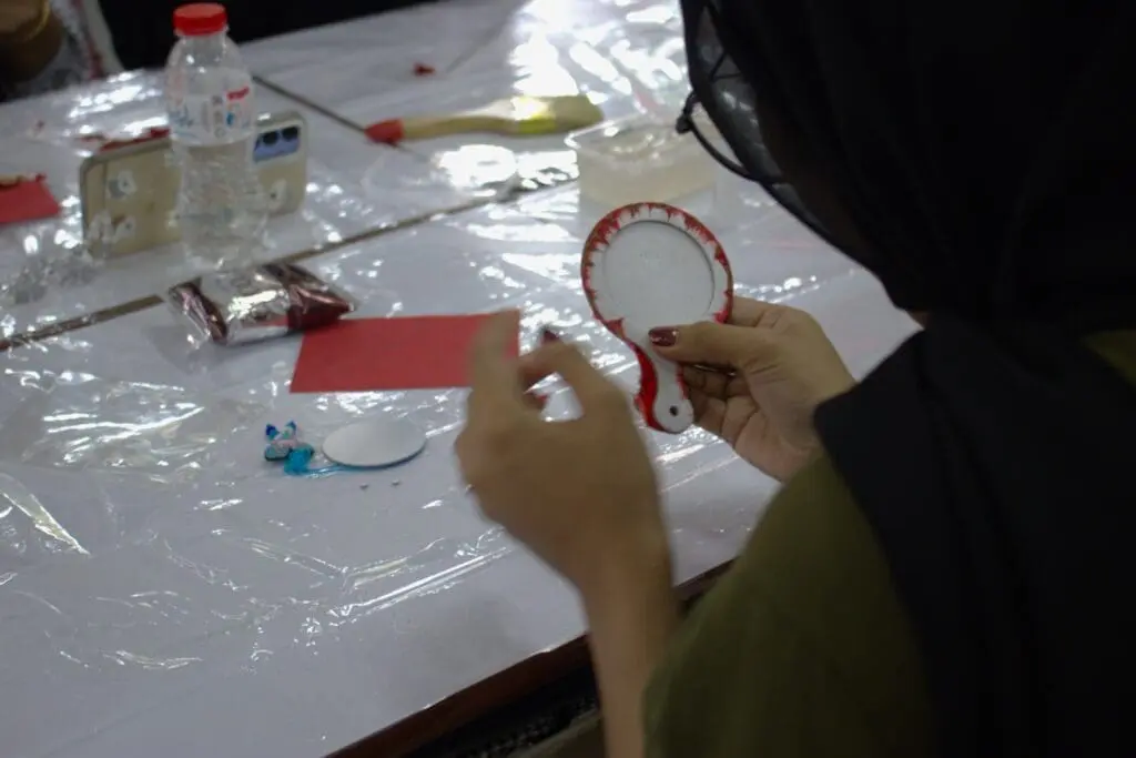 Setelah para peserta menerima alat dan bahan untuk pembuatan cermin Hanji, peserta kemudian mulai mengerjakan kerajinan tersebut sesuai dengan tahapan yang diberikan dalam bahasa Korea. Cara pembuatannya pun cukup mudah. Pertama, 2 sisi hard board ditempelkan menggunakan lem super agar melekat dengan kuat. Kemudian, kedua sisi Hanji dilapisi dengan lem kertas cair. Setelah itu, Hanji ditempelkan pada permukaan belakang hard board. Sisa kertas Hanji yang tidak dipakai kemudian ditarik ke arah depan sembari disobek. Hal tersebut dilakukan secara berulang kali untuk permukaan depan hard board. Jika langkah tersebut sudah selesai dilakukan, Hanji dikeringkan menggunakan hair dryer. Setelah kering, cermin ditempelkan pada hard board. Terakhir, bagian pegangan cermin dilubangi menggunakan tusuk gigi untuk dimasukkan hiasan tali simpul dan selesai. Cermin Hanji siap digunakan!