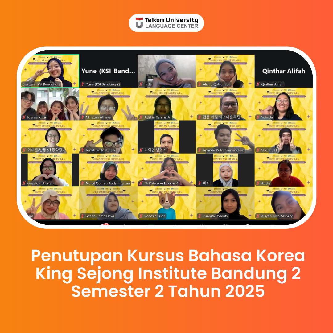 King Sejong Institute Bandung 2 (KSIB 2) telah melaksanakan Acara Penutupan Kursus Bahasa Korea Semester 2 Tahun 2025 pada hari Selasa, 30 Desember 2025 pukul 14.00 – 15.00 WIB. Acara yang dilaksanakan secara online ini dihadiri oleh 53 orang siswa, 2 orang pengajar, serta staf KSIB 2.