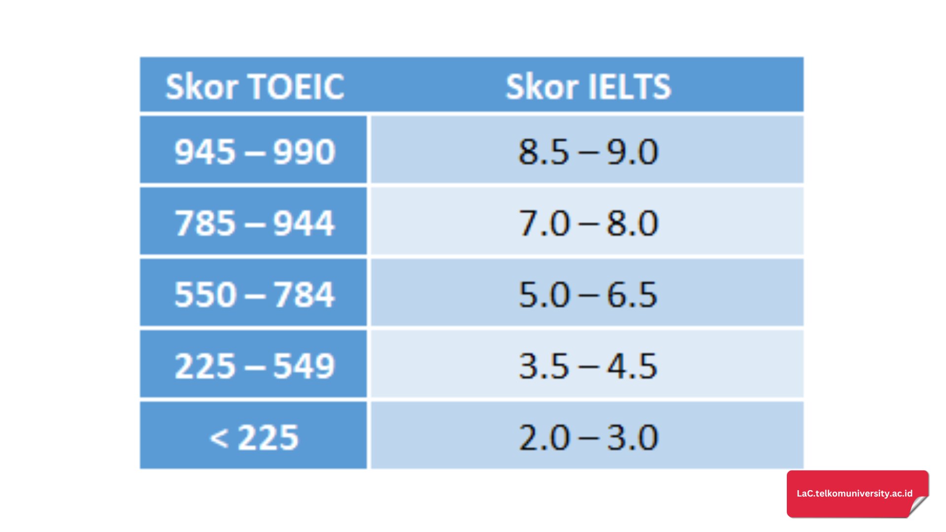 Berikut adalah estimasi konversi skor TOEIC ke IELTS: