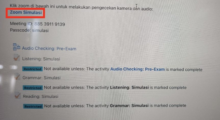 ● Untuk peserta tes online bersiaplah 30 menit sebelum tes. Pada Whatsapp Group, Admin akan memberikan file untuk tes, link Zoom, serta password untuk mengakses file tersebut. 15 menit sebelum jadwal tes zoom akan ditutup.