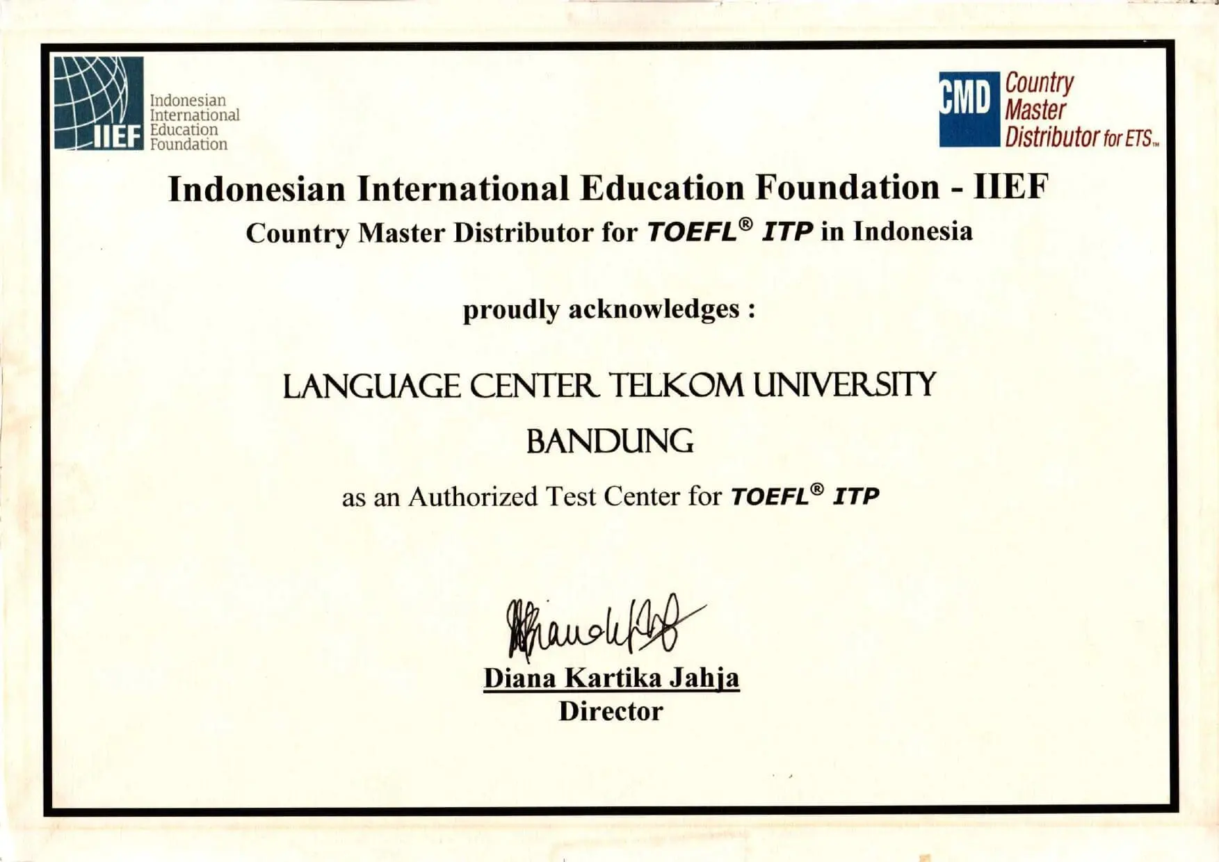 Pusat Bahasa Universitas Telkom merupakan authorized test center untuk TOEFL ITP® yang bekerja sama dengan IIEF (Indonesia International Education Foundation).