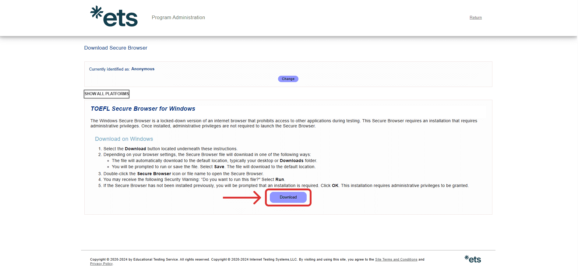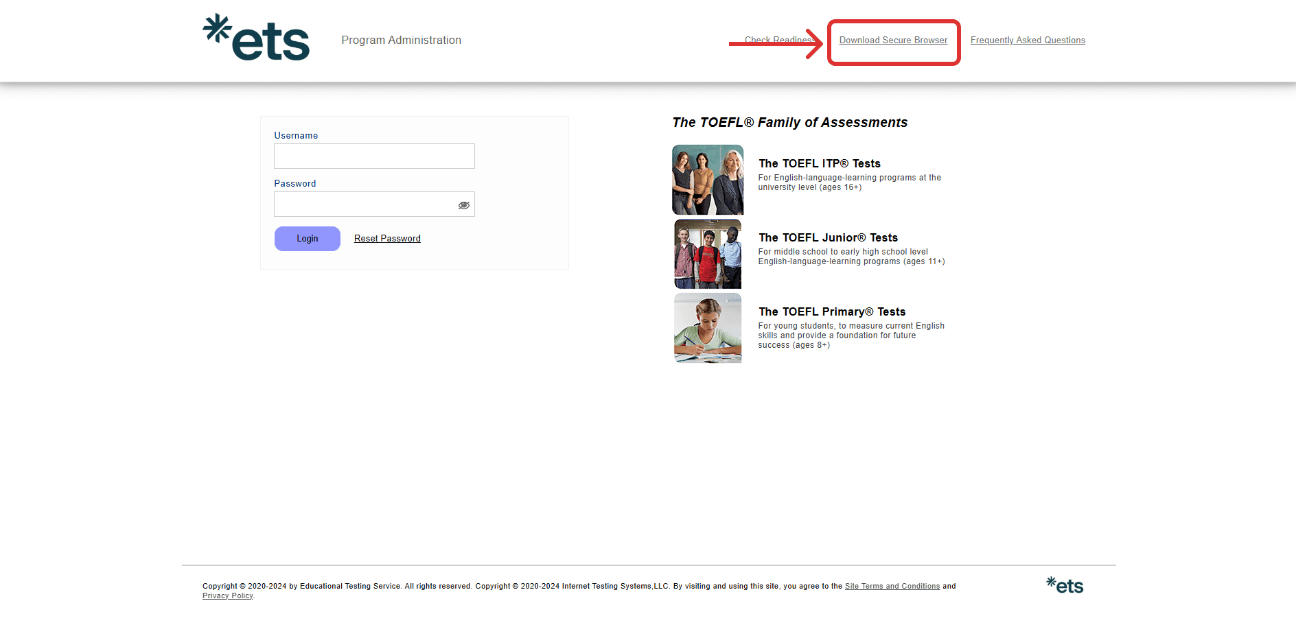 2. Buka laman http://www.ets-ellonline.org/ kemudian klik menu “Download Secure Browser“.