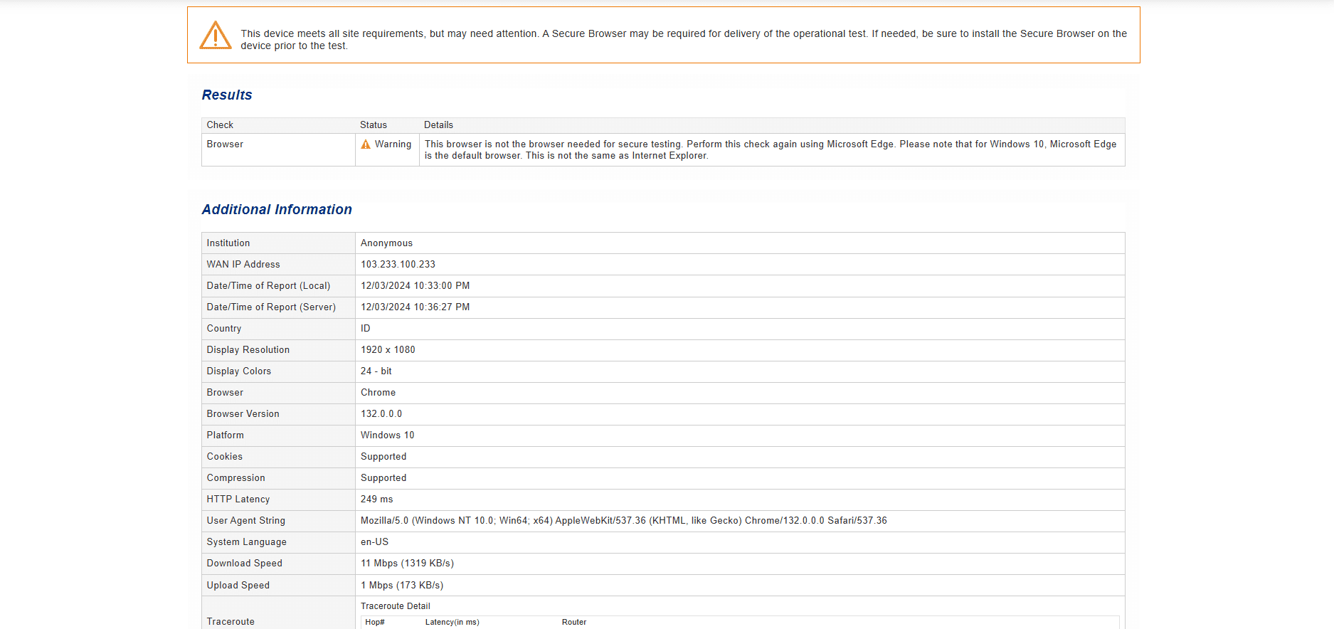 Sistem operasi Windows 7, Windows 8, Mac 10.11 ke bawah, Linux, tablet Android, smartphone Android/iOS, dan iPad tidak dapat digunakan untuk tes.