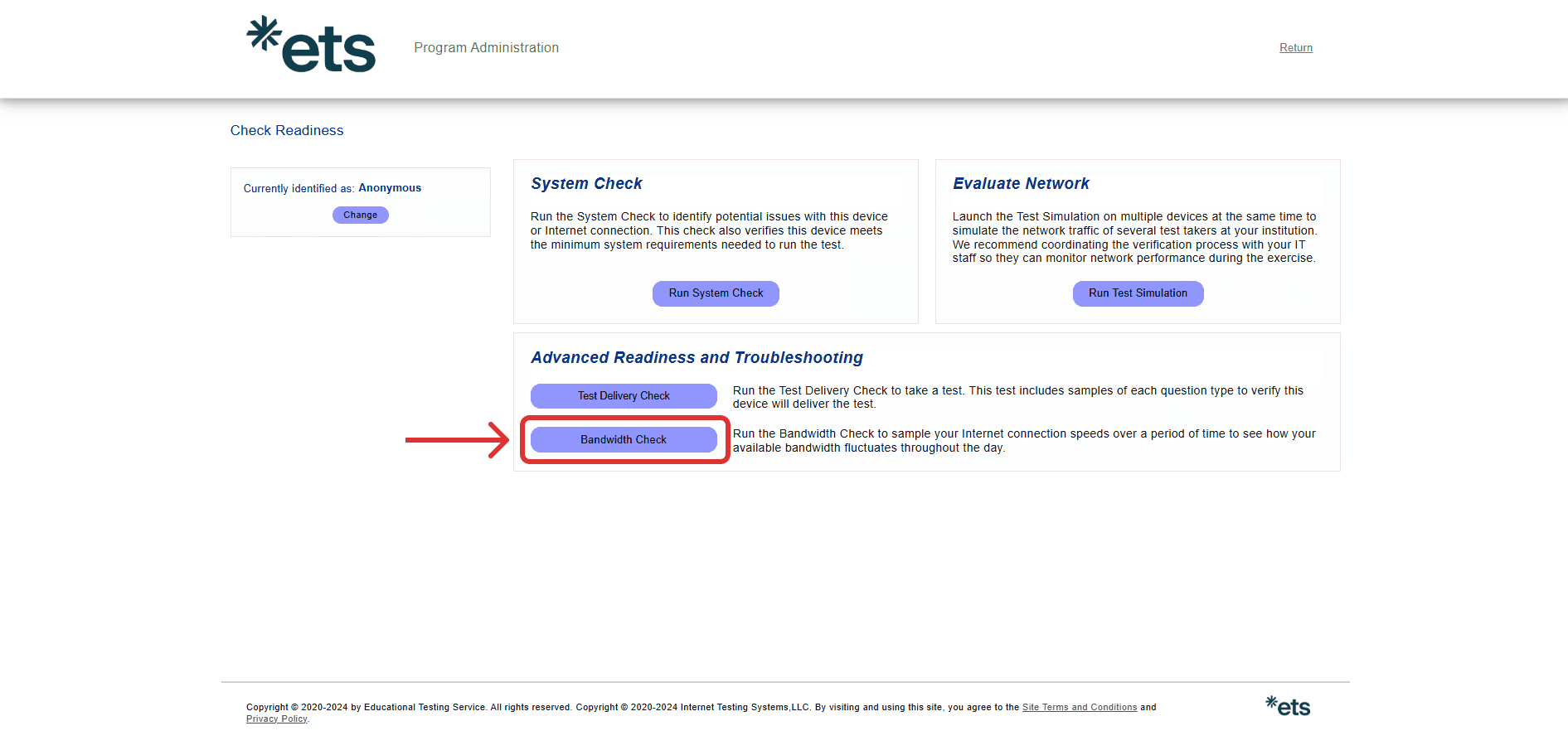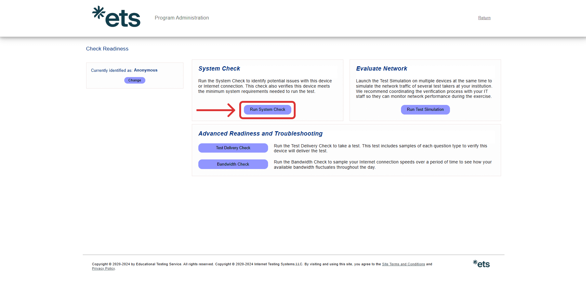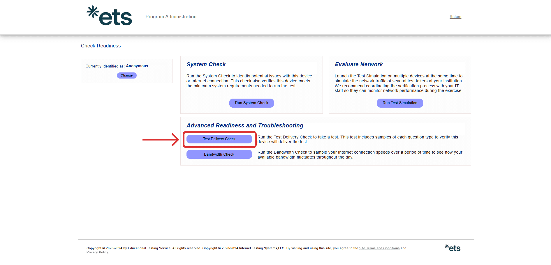 4.1 Pada bagian Advanced Readiness and Troubleshooting, klik tombol “TEST DELIVERY CHECK”. Anda akan melihat contoh soal dari setiap jenis pertanyaan untuk memastikan perangkat dapat menjalankan tes.