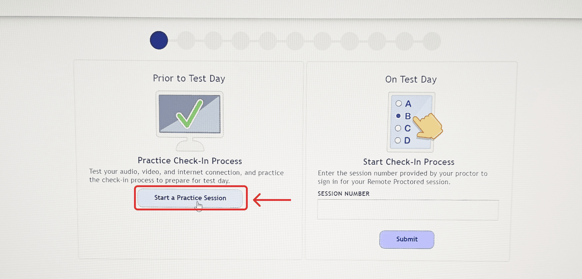 Setelah berhasil menyelesaikan proses Check Readiness, peserta tes diwajibkan untuk melakukan Practice Session menggunakan perangkat yang akan digunakan saat tes. Berikut langkah-langkahnya: