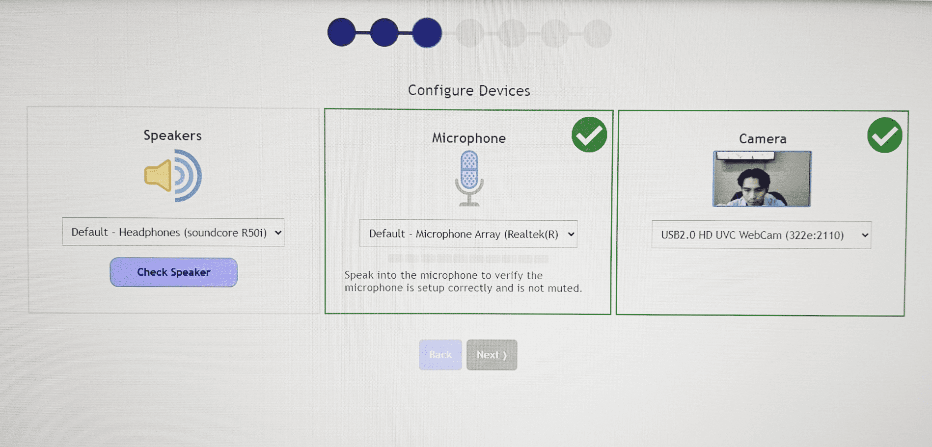 10. Selanjutnya anda akan melakukan proses system check dan jika proses system check sudah selesai dilakukan, maka seluruh fitur akan memiliki centang warna hijau. Jika proses system check mengalami kegagalan, silakan berkomunikasi dengan proctor dengan mengklik ikon chat.