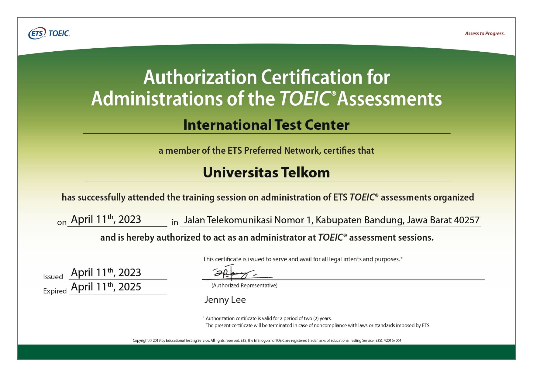 Pusat Bahasa Telkom University merupakan Certified Test Administration Site untuk tes TOEIC® yang bekerja sama dengan ITC.