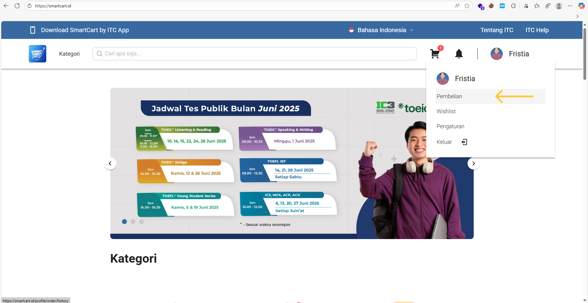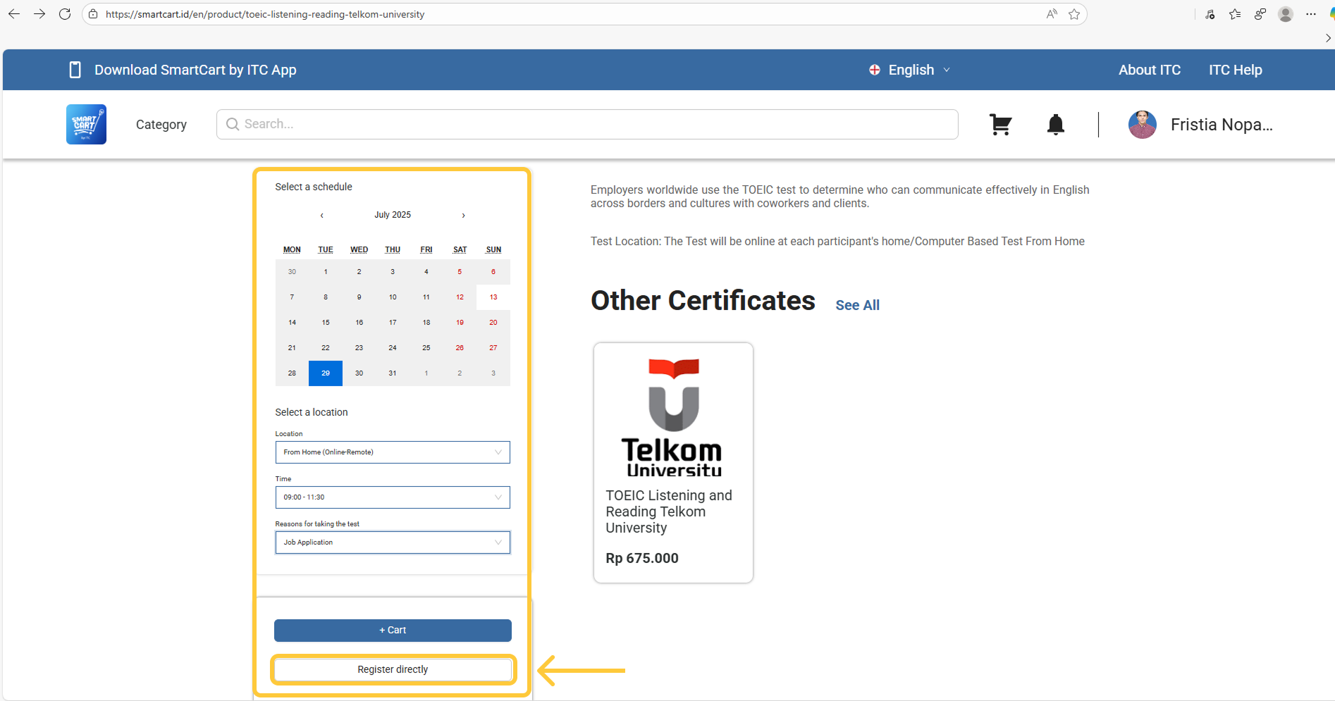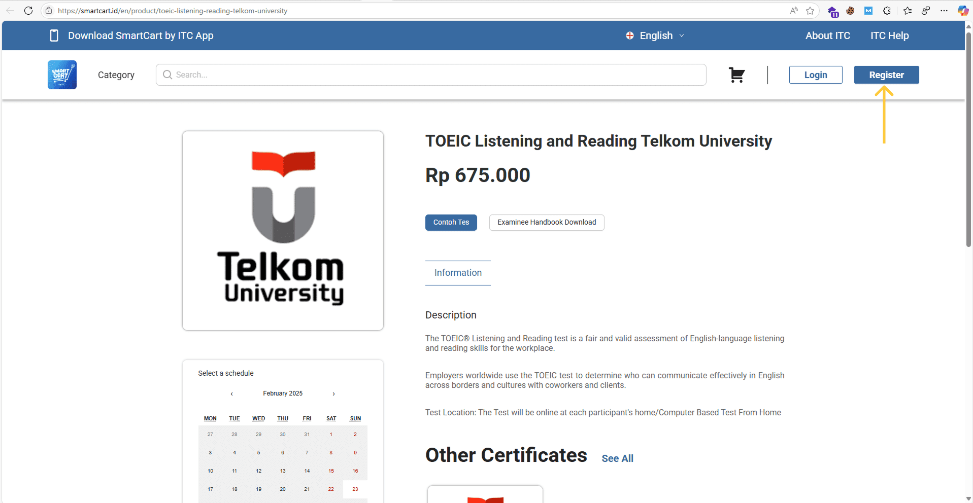 1. Kunjungi laman pendaftaran tes TOEIC Listening and Reading Telkom University di Smartcart dengan menekan tombol di bawah ini.