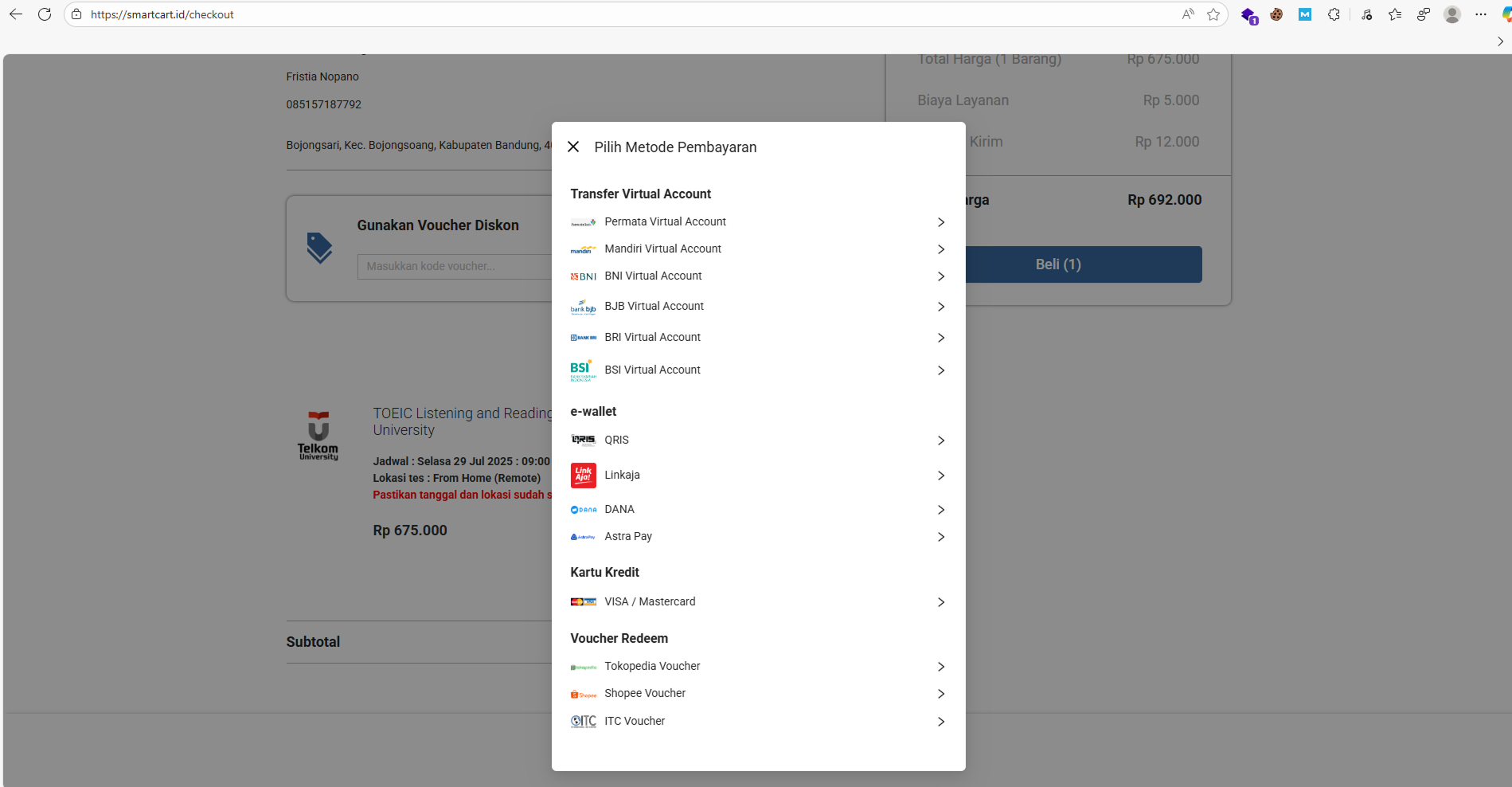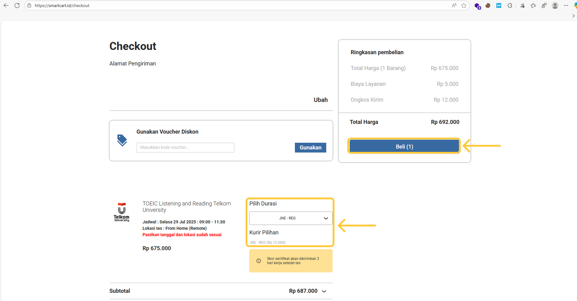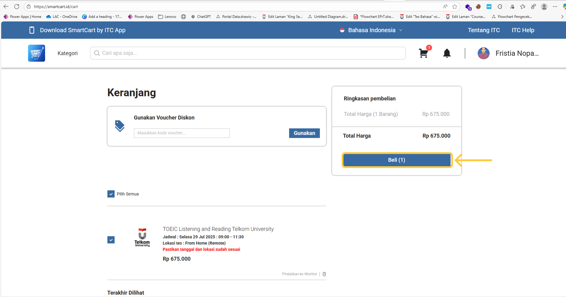 7. Di halaman Keranjang, pastikan produk TOEIC Listening and Reading Telkom University telah di ceklis, lalu klik “Beli.