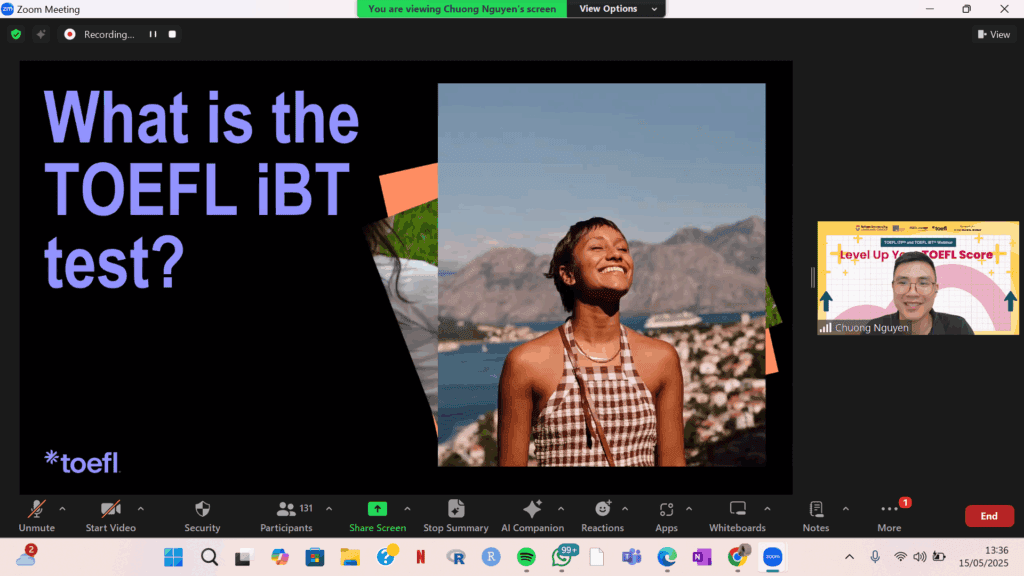 Pada hari pertama, webinar menghadirkan dua narasumber utama, yaitu Bapak Chuong Nguyen selaku ETS Channel Management SEA, dan Bapak Athino Rangga, TOEFL Program Coordinator dari IIEF. Pada sesi pertama, Bapak Chuong memaparkan secara komprehensif mengenai peluang studi di Australia dan pentingnya TOEFL iBT® sebagai syarat utama dalam proses pendaftaran akademik internasional. Setelah itu, webinar kemudian dilanjutkan oleh Bapak Rangga yang mengulas perbedaan TOEFL iBT® dan TOEFL ITP® secara menyeluruh, mulai dari struktur, fungsi, hingga tujuan penggunaannya. Kedua sesi ini berlangsung secara interaktif dan disambut antusias oleh para peserta yang aktif mengajukan pertanyaan dalam sesi tanya jawab.