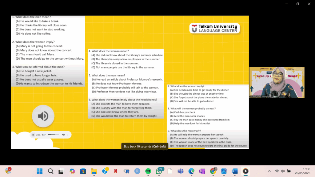 Telkom University Language Center (LaC) telah sukses menyelenggarakan webinar bertajuk “TOEFL ITP® & TOEFL iBT® Webinar: Level Up Your TOEFL Score” selama dua hari, yaitu pada Kamis, 15 Mei 2025 dan Jumat, 16 Mei 2025. Kegiatan ini terbuka bagi civitas akademika Telkom University (mahasiswa, dosen, dan staf), serta peserta umum yang sedang mempersiapkan diri menghadapi tes TOEFL dan ingin memahami lebih dalam strategi serta struktur tes tersebut. Webinar ini menjadi wadah diskusi interaktif bersama para narasumber dari ETS, IIEF, dan para instruktur berpengalaman dari LaC.