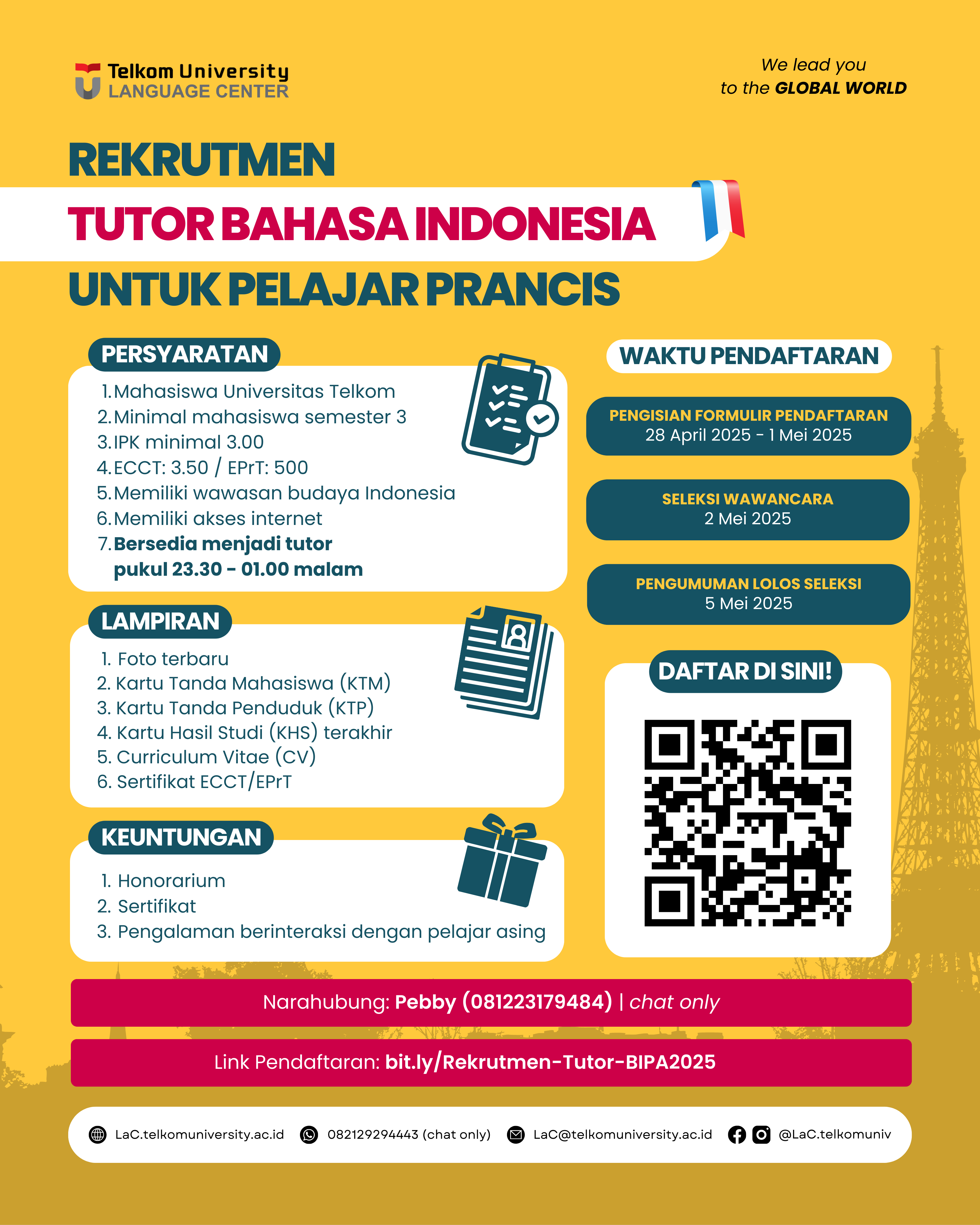 Catat tanggalnya dan jangan sampai ketinggalan ya! Ayo bergabung bersama kami dengan menjadi tutor bahasa Indonesia untuk pelajar Prancis!